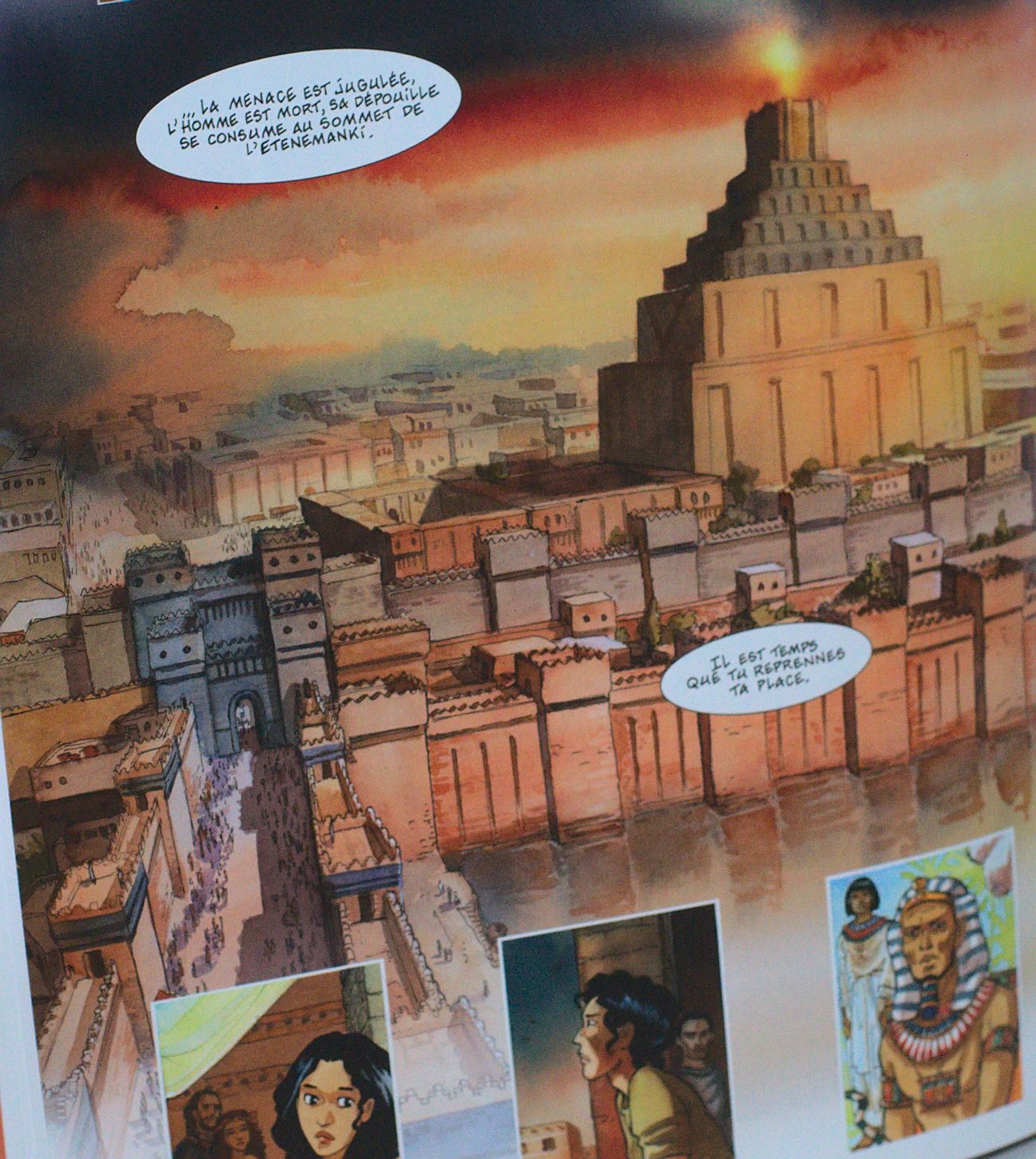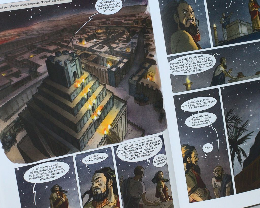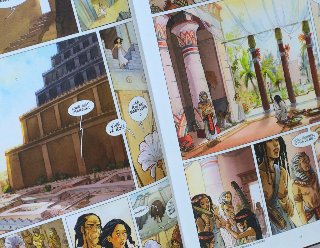 Les dessins sont précis, les couleurs vives alternant les scènes en pleine lumière, au coucher du soleil ou de nuit avec de beaux contrastes lumière-ombre. Isabelle Dethan dessine puis colorie à l’aquarelle chaque planche à l’ancienne, à la main ! Au final, c’est une superbe opportunité pour le lecteur d’imaginer ces jardins et cette Tour de Babylone dont il ne reste qu’un souvenir de l’ordre du mythe. Le texte est présent mais laisse une grande place au dessin, c’est ainsi que j’aime la bande dessinée, quand elle n’est pas trop bavarde ! L’auteure a fait des recherches sur la décoration et les peintures d’intérieur des palais afin d’être la plus réaliste possible. Elle s’est rendue plusieurs fois en Égypte afin de s’imprégner des lieux et réaliser des croquis sur place. La végétation est particulièrement bien mise en image.